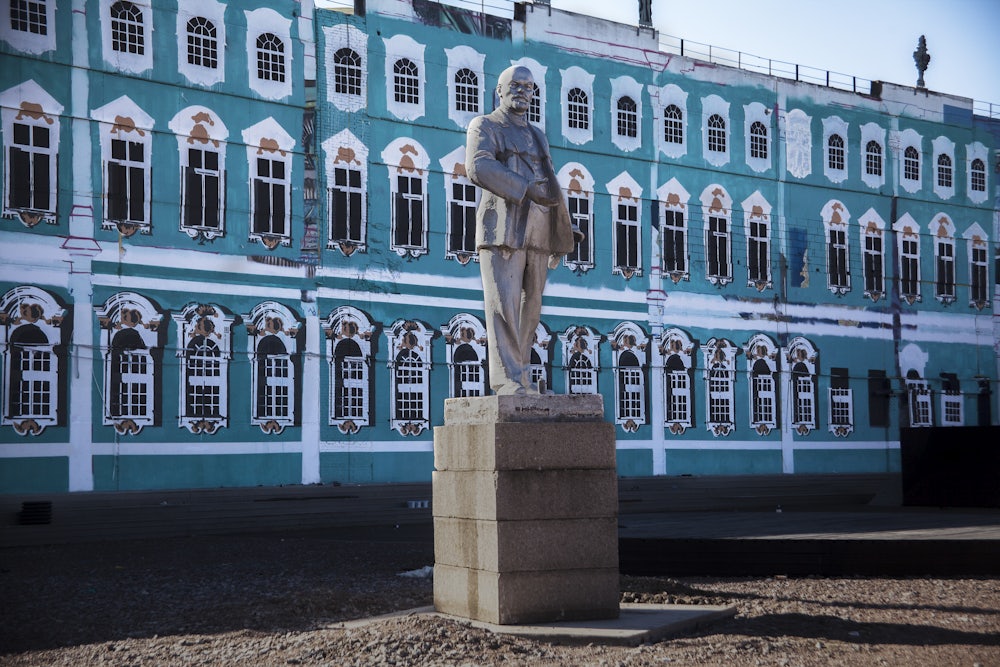 This year’s exhibit, co-curated by 27-year-old Andrei Zaitsev, is entitled “Brighter Days Are Coming,” a nod to the Soviet utopian promises that often sounded more like threats. The theme is revolution, in honor of the centennial of the Russian Revolution. The Street Art Museum’s location evokes the revolutionary industrial aesthetic, which inspired the Russian avant-garde as well as Stalinist kitsch—for example, Bright Path, a 1940 musical comedy in which the heroine sings triumphantly while inspecting a large number of mechanical looms. As a physical space, the decrepit factory turned street art museum offers a near-ideal vantage point from which to contemplate the last century of Russian history, when churches, palaces, and factories alike have been treated as temples, constructed with fanfare and then torn down, repurposed, or abandoned and left to crumble after the fall of the old regime.