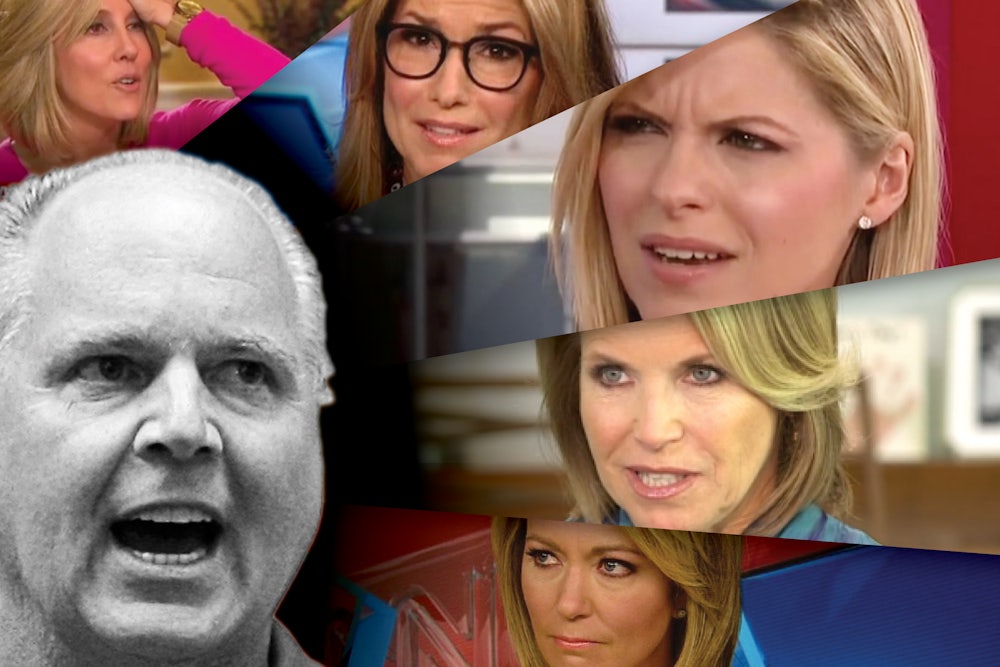 The word does even more than that. Whereas “babe” is a slang term for a woman, its literal definition is “infant” or “baby.” So Rush is not only reducing these journalists to their gender, but equating them with children. And there’s no question, given how Rush uses “infobabe,” that he intends to demean his targets. This is how Limbaugh described Sabrina Rubin Erdely, the author of Rolling Stone’s retracted campus rape story, last November: “You know, an infobabe reporter made it all up and then blamed it on a source. Well, the source may have made it up and the infobabe didn’t question it because the infobabe wanted the story to be true, but none of it was true.” This past May, Limbaugh set up an audio clip in which “a CNN infobabe and reporterette loses her mind on a pro-Trump guest. We’re talking here about Kate Bolduan. She’s the blonde girl who has the perpetual scowl...” Limbaugh uses the term almost exclusively when he’s criticizing women’s reporting—and sometimes their facial expressions, too.