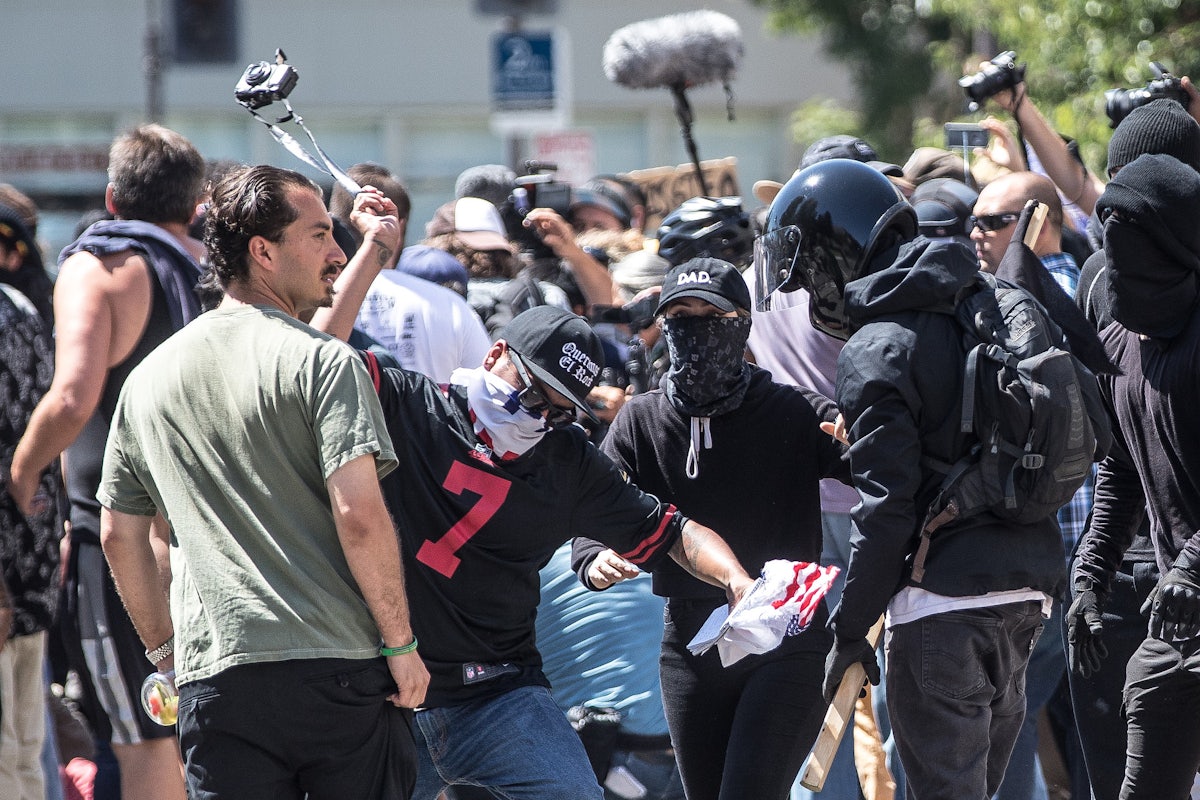 I had barely stepped off Martin Luther King Jr. Way in Berkeley, California, when I saw the first signs of violence: two dozen protesters scattering like pigeons from a formidable assemblage of masked, black-clad, so-called anti-fascists, many wielding clubs and plywood shields. Like pigeons, humans can be both intelligent and inexplicably stupid, and so it was that I followed the flock as it went right back toward the chaos, on the Civic Center lawn, for a better view. I expected to see a dust-up, a handful of white supremacists in MAGA hats, angry that that they’d been denied a permit to spew their reprehensible bile due to a “culture of political correctness” or some other preposterous catchphrase. What I saw was a photographer—a white guy, thirty-something, pink shorts, black tee-shirt; media affiliation, if any, still unknown—taking blows to the head and body while cradling his camera like a football recovered post-fumble. Evidently, he’d captured something the antifas didn’t want him to document. They wanted to destroy the evidence, and he wasn’t going to hand it over.