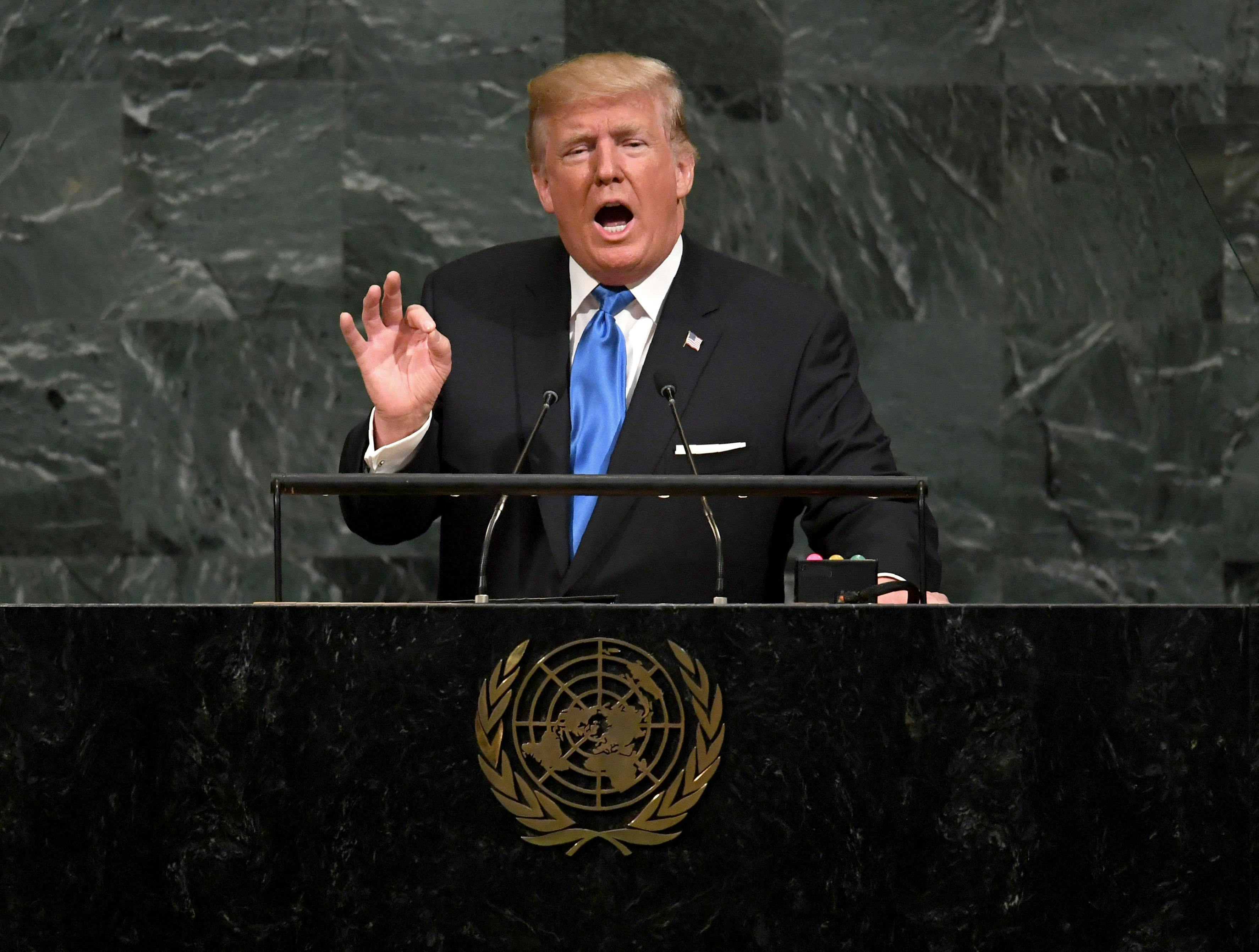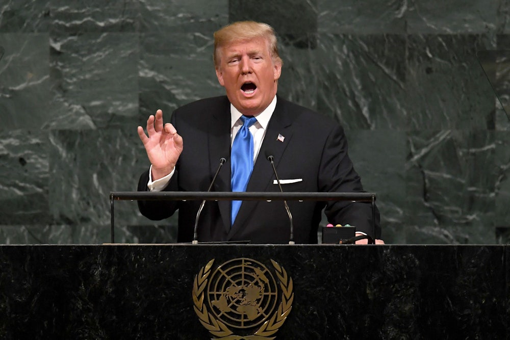 We heard a lot this week about how we would see a new, sober Trump at the U.N., but instead we got the American version of Qaddafi. Trump threatened to “totally destroy” North Korea. He referred to Kim Jong Un as “rocket man.” He said parts of the world were “going to hell.” He basically delivered Bush’s notorious Axis of Evil speech, except he excluded Iraq, added some choice bits from his American Carnage speech, and amped up the crazy. If you have ever wondered what it would be like to be represented by a wild-eyed megalomaniac—minus the flowing robes and abundant military medals—take a look.