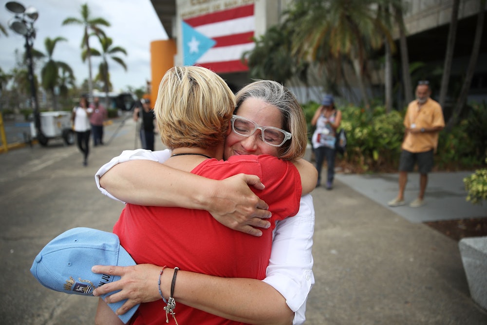 Mejías and Gandía met in the early 2000s at the Universidad de Puerto Rico Río Piedras, which has been a hotbed of student opposition to austerity on the island and draconian education cuts in particular. Careers in theater and film lured them away from the island—Mejías is an award-winning actress; Gandía recently finished a season as a set costumer on the NBC cop drama Shades of Blue—and they’ve each endured the familiar resentments that accompanied their decision to leave. The hurricane, says Mejías, has erased those divisions, at least for now. “We’re all working for one goal.... It’s like nos hemos vuelto un país.” It’s like we’ve become a country.