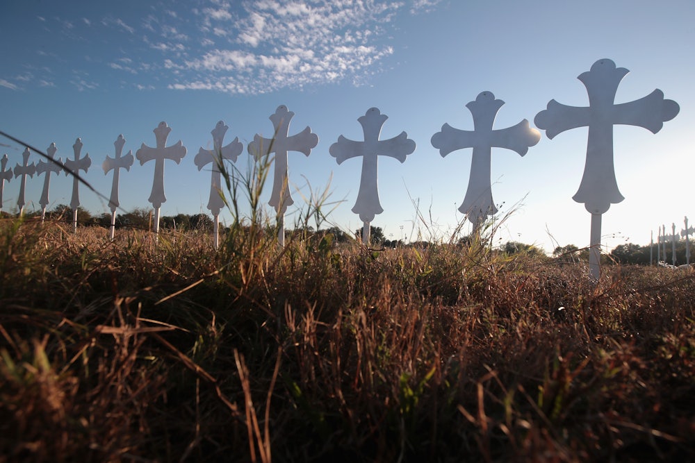 In 2012, the same year Adam Lanza murdered 20 kindergarteners along with six of their adult caretakers, 58 percent of white Evangelicals reported owning guns and only 35 percent supported stricter gun control laws. This, despite the fact that churches have been targeted by gunmen with some frequency. Kelley’s mass murder is the deadliest of its kind, but it is hardly the first. Emanuel Samson shot eight people, killing one, at Burnette Chapel in Tennessee in September; Woodrow Karey murdered his pastor in Louisiana in 2013; and Jim Adkisson opened fire on the Tennessee Valley Unitarian Universalist Church in 2008. In 2015, Dylann Roof shot and killed nine Christians at a historically black church in Charleston, South Carolina. Mass shooters have murdered pious Christians in other, less sacred contexts, all while conservative Christians and their representatives in Congress look at their feet and shrug.