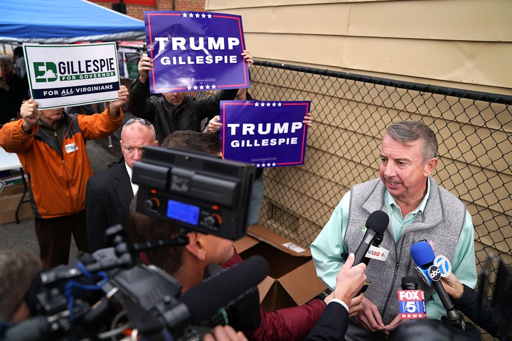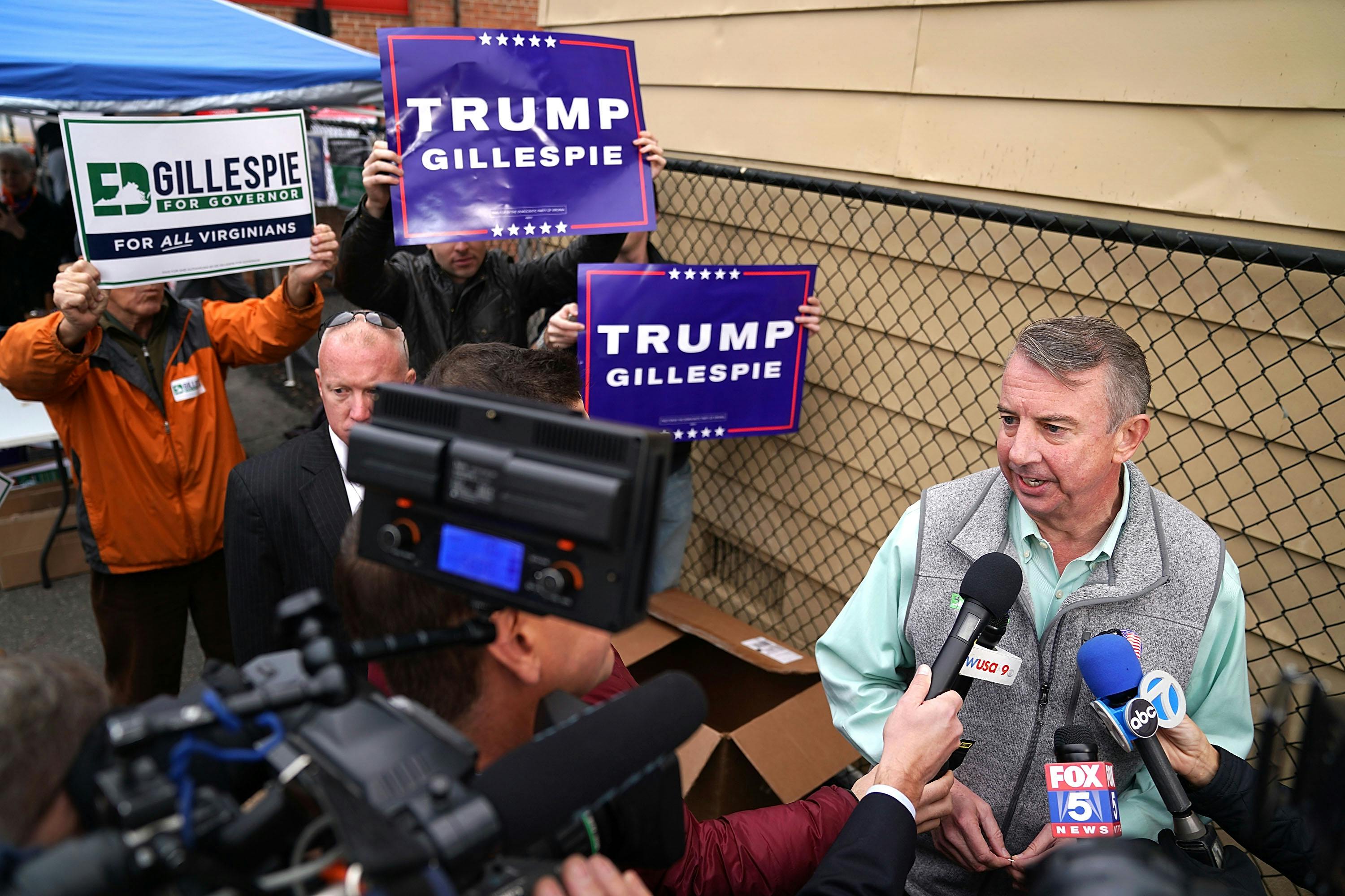 There were also signs that Republicans had figured out a way to capitalize on Donald Trump’s unlikely success in 2016. Gillespie, a former Republican National Committee chair and lobbyist synonymous with the Republican establishment, seemed to have found a playbook that could work for Republican candidates. Gillespie kept his personal distance from Trump, but embraced his underbelly-of-American-politics style. The tax cut that Gillespie ran on in the Republican primaries was out; defending Confederate monuments and attacking the gang MS-13 were in. This combination, which allowed Gillespie to appeal both to suburban voters and to Trump diehards, was considered potentially lethal. Trump may be historically unpopular, but Gillespie had apparently found a way to square the circle.