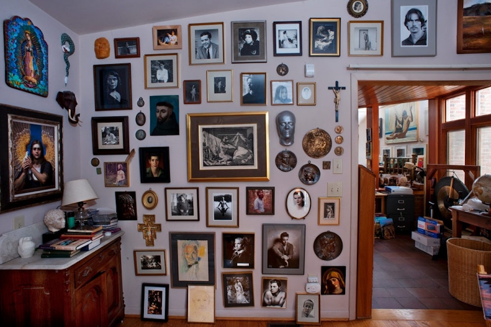 Those books and manuscripts are part of Price’s biography, but so are the pictures, sculptures, paintings, and statues that represent the friends, idols, family, students, and mentors who were Price’s fellow travelers. These “household gods,” as Price called them, were “images of what I have loved and love and worship—worship in the sense of offering my life and work to them.” Nearly every wall and every surface of the house was tenderly cluttered with these people: their faces, their hands, their backs, their torsos, their smiles and stares. Family snapshots lean against busts of Milton and death masks of Keats, while glamorous headshots of James Dean and Gregory Peck hang alongside Mary Magdalen and the Sacred Heart of Jesus. Price’s younger brother is as likely to appear around any corner as his friend James Taylor, and crayon drawings are hung as carefully Renaissance paintings.