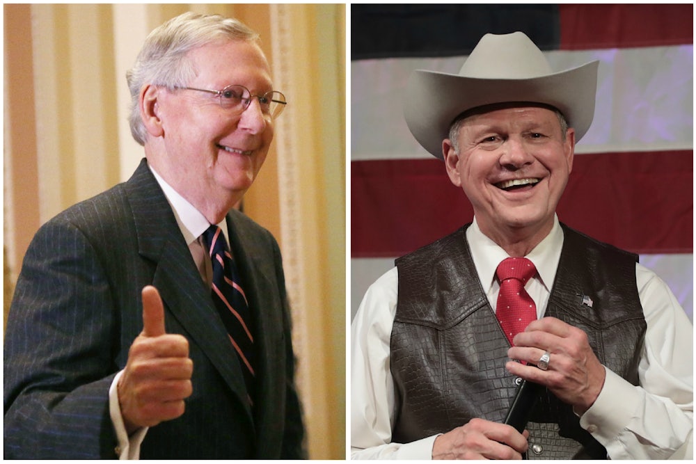 Speaking of which: Tax cuts are the very reason that Republicans leaders in Congress have adopted the “if true” response to the allegations against Moore. If the party loses the Alabama seat, which until recently was held by Attorney General Jeff Sessions, then the margin of error for their tax overhaul is reduced to just one vote. That’s why McConnell and others, in their initially qualified remarks, are effectively handing over decision-making power to Roy Moore. As Ryan Lizza noted in The New Yorker, “[A]lthough McConnell’s statement appears relatively strong on its face, his ‘if it is true’ caveat actually offers Moore a loophole to stay the course.”
