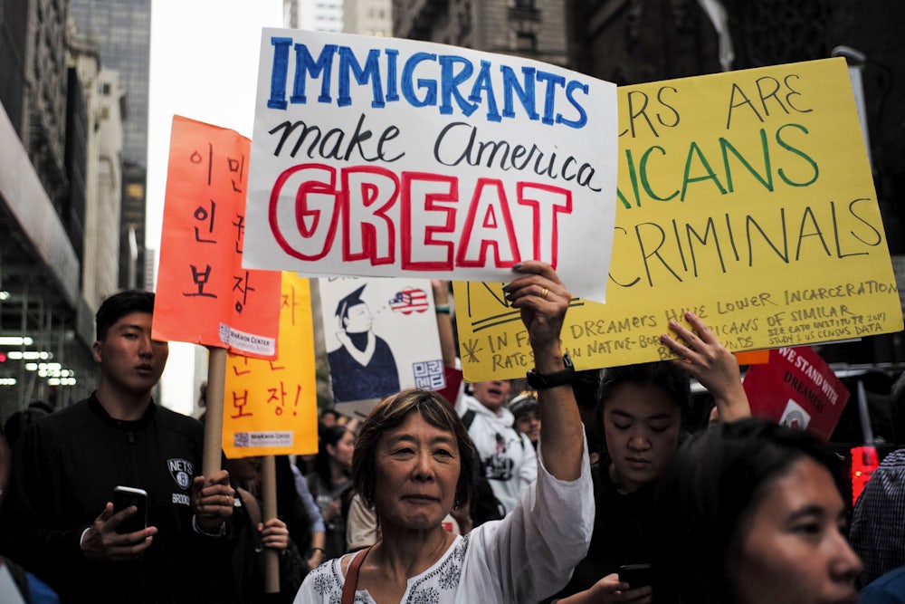 Tuesday’s ruling came only hours after Democratic and Republican leaders met with Trump at the White House to discuss immigration. True to form, the president took confusing and contradictory stances. At one point, California Senator Dianne Feinstein suggested that Congress could pass a “clean” bill that only addressed the DACA program. Such a move would effectively give Democrats what they want while pushing Republican priorities to a later date. “I have no problem,” Trump replied, to the room’s astonishment. “I would like to do that.” House Majority Leader Kevin McCarthy then interjected to remind the president of his own party’s policy goals—to pair a DACA fix with Republican goals, which include funding a border wall and ending the diversity visa lottery.