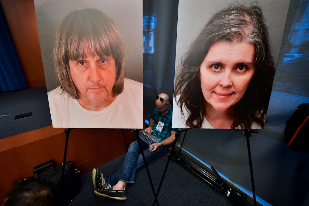 The Turpins, then, answered to no one, and thus shielded their abuse from anyone in a position to report it to the authorities. At a press conference on Thursday, the Riverside County district attorney’s office stated that the children suffered from muscle wasting and brain damage linked to starvation; a 29-year-old daughter weighs 82 pounds. They were chained and padlocked to beds and chairs and were not always released to go to the bathroom. They showered once a year. David Turpin has additionally been charged with at least one count of a lewd act upon a child by force or duress.