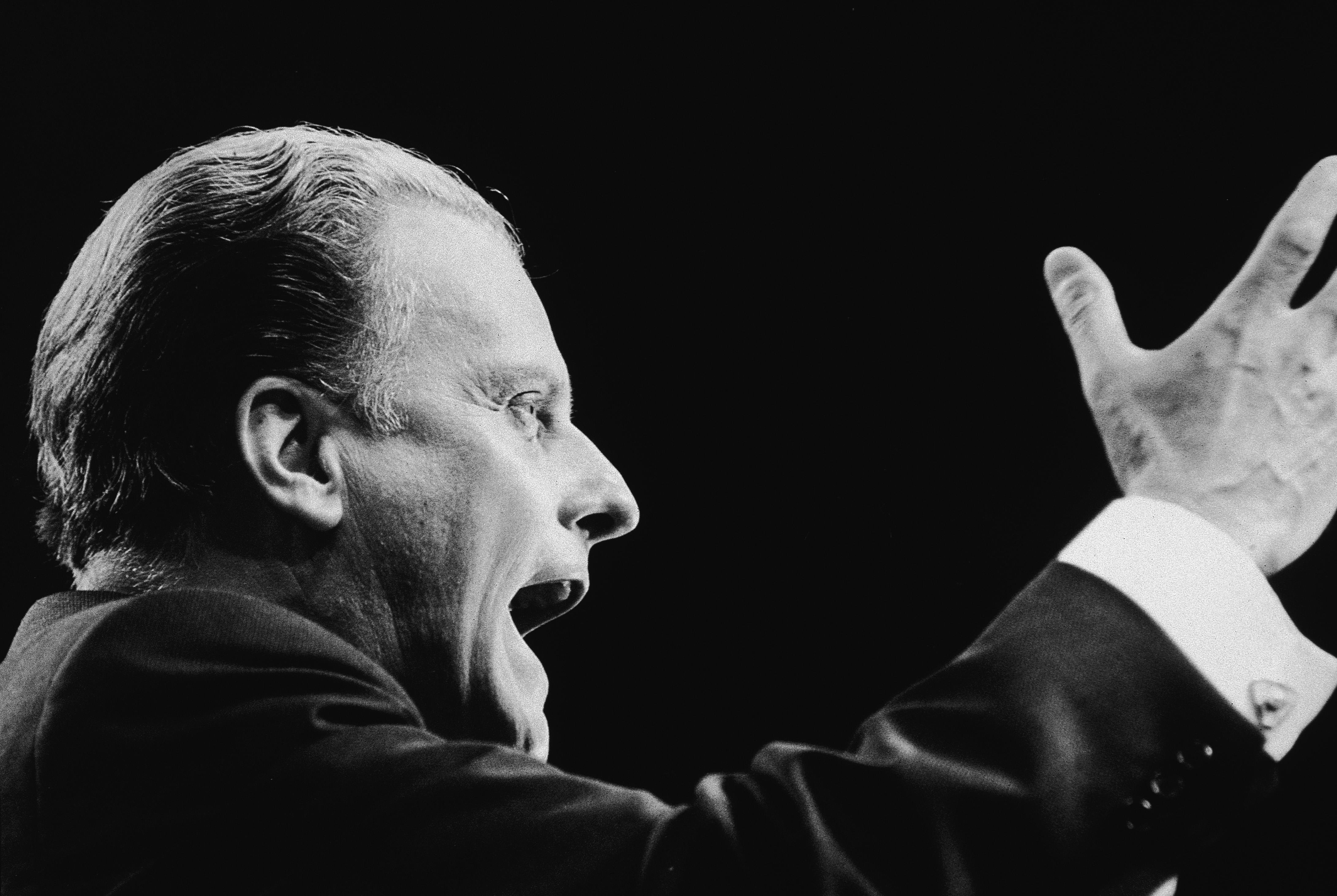 Graham conveys this expectancy with simplicity and gratitude. Undiscourageable and gently self-deprecating, he is free of the anger that seems to animate other televangelists. He may be the best modern exemplar of what the first American Protestants called the “plain style”—a homiletical manner free of adornment and abstraction, and devoted, above all, to transmitting the gospel to “the meanest understanding.” As one of his friends puts it, “An evangelist can’t be complicated. They are great persuaders, not explainers.”