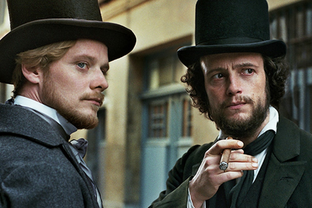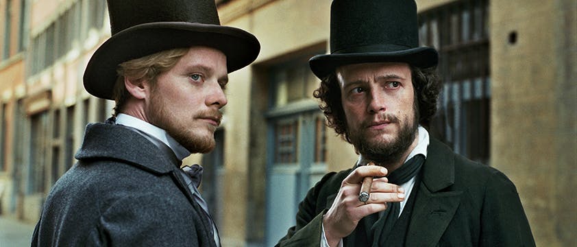 The Karl Marx of Peck’s film is, in a bizarre bit of casting, played by the German actor August Diehl. You may remember Diehl as an extremely blue-eyed and anemic-looking Nazi from Inglourious Basterds. Here he is clad in dark wig and brown contact lenses. He begins the movie as a stranger to Engels, played by Stefan Donarske. Marx is broke and bitter (“I’m sick of all you Young Hegelians”). Engels is a rich kid whose father owns the very factory that he has been studying. They are wary of one another at first, but then confess their love of each other’s writing in the parlour of the publisher Arnold Ruge.