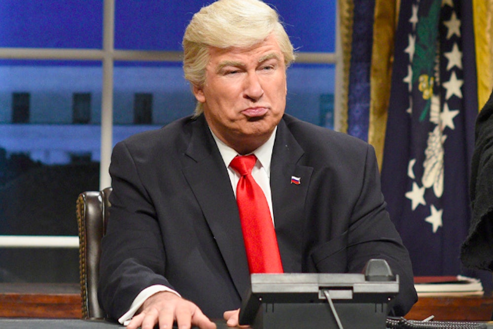 Baldwin deserves some credit for advancing a more menacing depiction of Trump, but his take is still slap-dash and perfunctory. He sleepwalks through all of the now familiar Trump tics, without offering much in the way of jokes, let alone insight. Anthony Atamanuik, who does a much better Trump, grasped Trump’s thuggishness and insecurity long before Baldwin did, and Baldwin has paid tribute to Atamanuik’s superior impression by insecurely badmouthing the less successful comedian and actor on late night TV. Also, Baldwin gets the voice wrong.