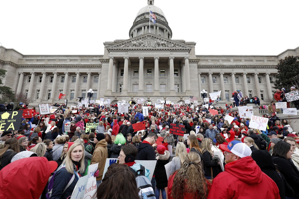What has been happening in so-called Trump Country—West Virginia, Oklahoma, Kentucky, and Arizona, specifically—in recent months is then deeply connected to the shifts that have come before. Indeed, the visuals of red-clad teachers in capitol buildings recall nothing so much as the 2011 capitol occupation in Wisconsin, where teachers alongside other public sector workers camped out, sang, danced, and challenged the austerity agenda that was pushed—ultimately, successfully—by Governor Scott Walker. Act 10, the anti-union law that sparked the occupation, left teachers and other public employees able to bargain only for cost-of-living increases. They have to recertify their unions every single year—and a non-vote counts as a no.