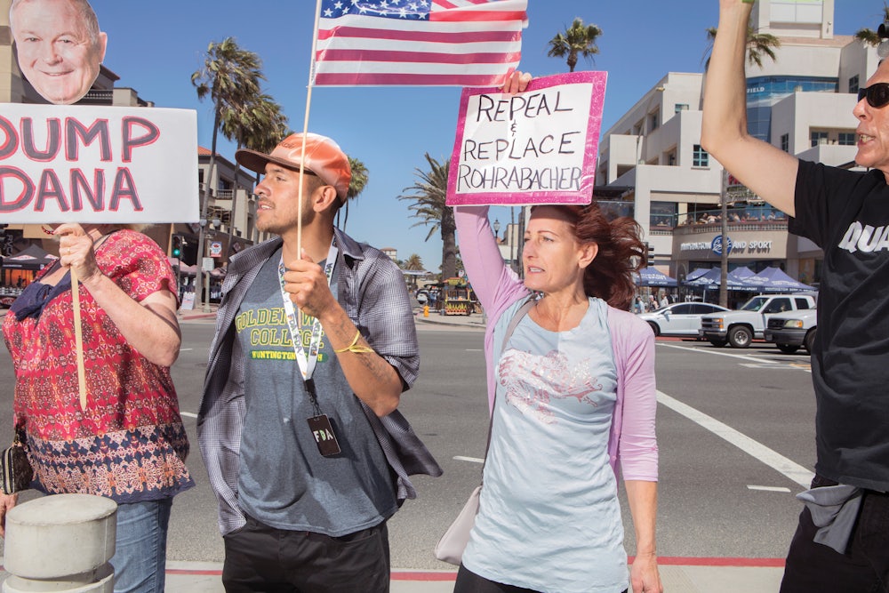 Indivisible OC 48, in Rohrabacher’s district, has been among the most organized. Rohrabacher, in office since 1989, has a loyal constituency. While he stands to the right of Orange County voters on issues like gun rights and immigration, he embodies the local culture on an aesthetic level—he surfs, smokes pot, and plays the banjo—and, perhaps more importantly, has never faced a serious, well-funded opponent. In 2016, voters in his coastal district, which includes Huntington Beach and Laguna Beach, narrowly chose Clinton over Trump, but they handed Rohrabacher a victory of nearly 17 points.