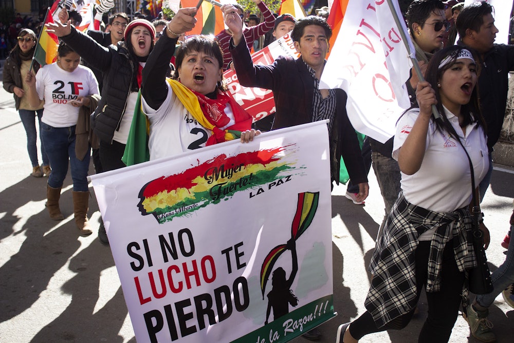 The morning ceremony was relatively uneventful, with the expected military parades followed by Vice President Álvaro García Linera’s address and Evo’s state of the union. The real action picked up after the official ceremonies were over: After the military parades and addresses from the president and vice president, the police barricades were disbanded, which allowed protesters to flood in with massive “BOLIVIA DIJO NO” banners—“Bolivia said no.” No to the re-election, no to Evo’s Movimiento al Socialismo (Movement Towards Socialism, MAS) party, no to the addresses that had been made by Evo and Linera less than an hour before.