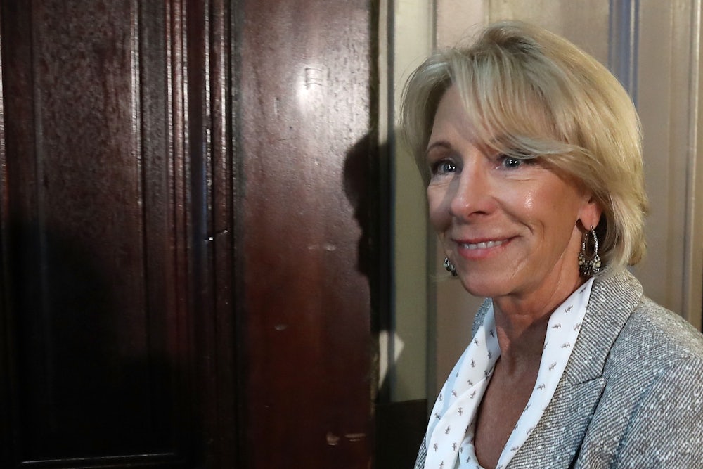 Even the most ardent feminists would acknowledge that Title IX is an imperfect tool to combat a rampant problem. But there’s evidence that DeVos isn’t operating in good faith. She chose Candice Jackson to head the department’s Office for Civil Rights, which investigates Title IX complaints; Jackson once asserted to the Times that “90 percent” of assault complaints “fall into the category of ‘we were both drunk,’ ‘we broke up, and six months later I found myself under a Title IX investigation because she just decided that our last sleeping together was not quite right.”