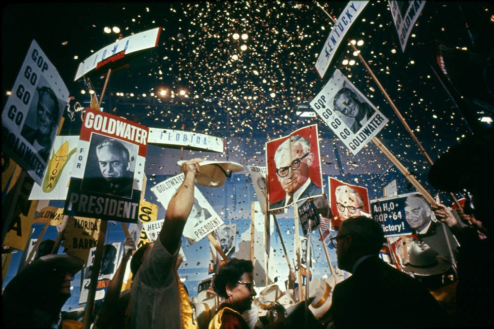 What Reston missed was the sophistication of Goldwater’s rhetoric, helped along by the writings of Buckley, Bozell, and Bernstein. He overlooked as well the Southern strategy devised by NR’s publisher, William Rusher. It wasn’t a new idea. Goldwater’s first stab at the presidency, in 1960, had begun in South Carolina, when he won the delegates at the state Republican convention, catching Nixon off-guard. It was his first successful “duck hunting” expedition—that is, courting the votes of middle-class whites in the “New South,” with its rising business class. Uncomfortable with the overt race-baiting of Dixiecrats, these voters responded to a broader argument cast in the language of states’ rights and free enterprise, the true pillars of the constitutional republic as opposed to the Democrats’ promise of egalitarian democracy. You could make this case, and Goldwater did, without mentioning race at all. Buckley made the same adjustment. Instead of saying black people were inferior—National Review’s line in the 1950s—he now argued that Goldwater “does not intend to diminish the rights of any minority groups—but neither does he desire to diminish the rights of majority groups.”