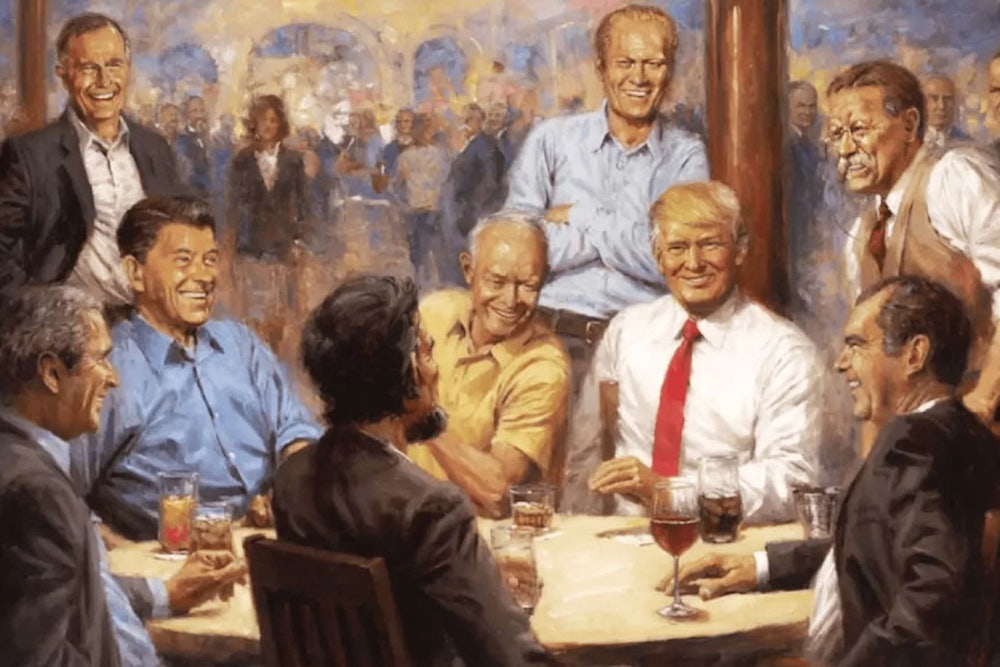 The 60 Minutes interview with President Donald Trump revealed an unusual piece of decor news: a painting by Andy Thomas called “The Republican Club” which shows a slimmed down Trump playing poker at a table with some of his illustrious (and sometimes infamous) GOP predecessors including Abraham Lincoln, Teddy Roosevelt, Richard Nixon, and Ronald Reagan.