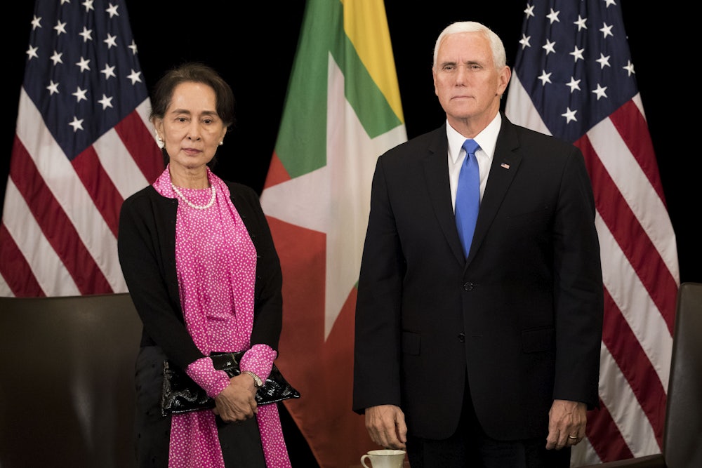 While attending the the Association of Southeast Asian Nations (ASEAN) Summit in Singapore on Wednesday, Vice President Mike Pence met with Myanmar leader Aung San Suu Kyi and chastised her for the atrocities her government is committing against Rohingya Muslims. The State Department has accused Myanmar of committing ethnic cleansing. Pence said atrocities against the Rohingya are “without excuse.” He also reprimanded Suu Kyi for the imprisonment of two Reuters reporters. “In America, we believe in democratic institutions and ideals, including a free and independent press,” the vice president said. “The arrests and jailing of two journalists last fall was deeply troubling to millions of Americans.”