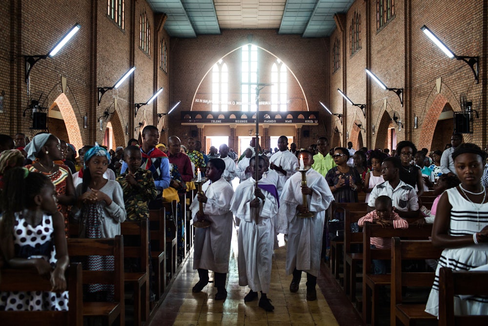 Just a week earlier, President Joseph Kabila, who has ruled the Democratic Republic of Congo for nearly 18 years, enriching himself and his family on the country’s vast natural resources, had announced he would not be standing for re-election in December. Those filling the wooden pews were one of the reasons why. Seated side by side were four of the Catholic lay leaders who organized the demonstrations many of the worshippers had participated in. Hunted by authorities for months, they came out of hiding for a service of thanksgiving—and to plot the road ahead.