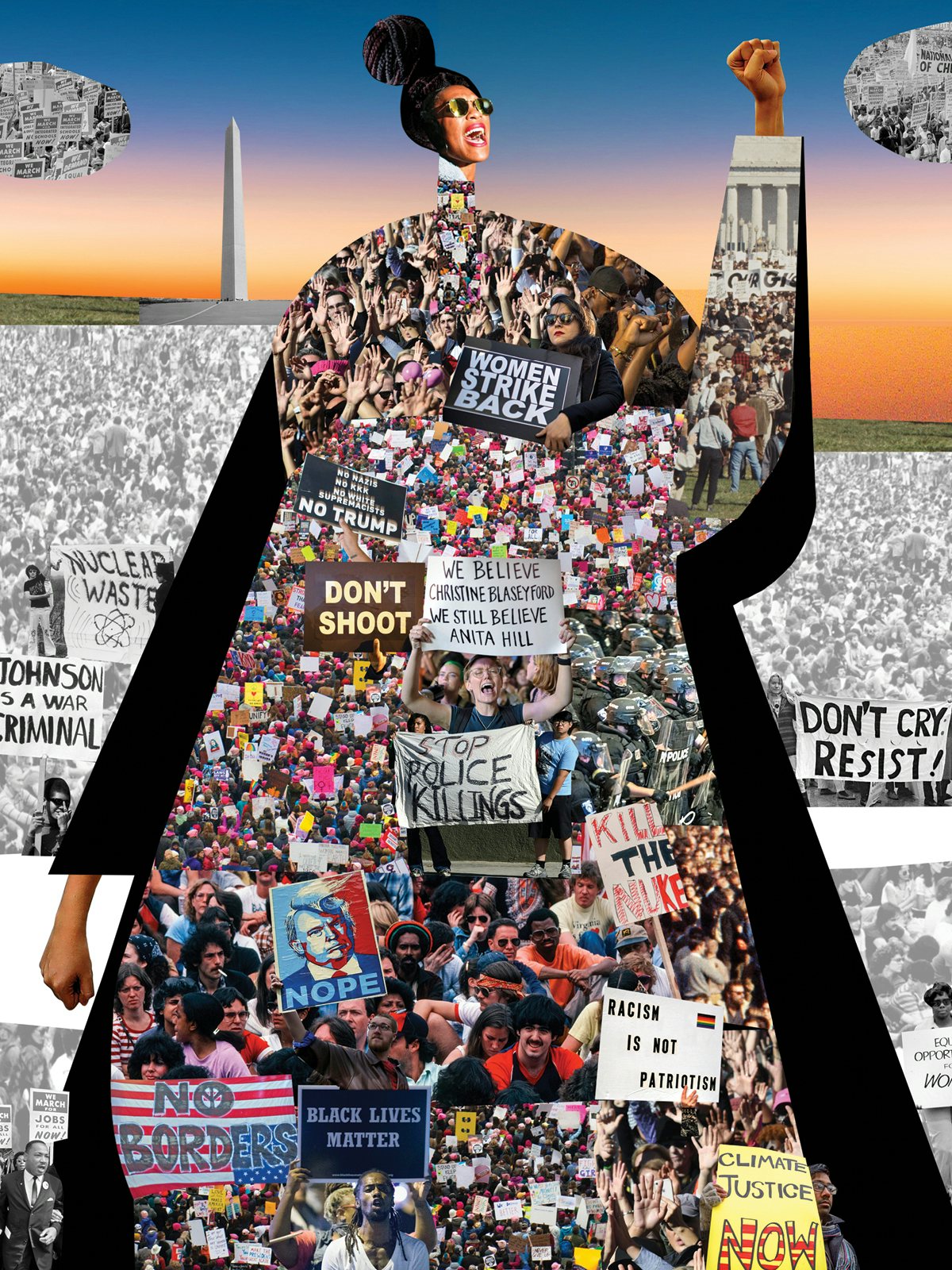 Later generations of activists rebelled against this style of organizing, in the more freewheeling antiwar marches of the 1960s and ’70s, and in the gay and lesbian rights, women’s rights, and labor rallies of the ’70s, ’80s, ’90s, and ’00s to the raucous present. Never again has there been a mass march whose marshals so effectively controlled what participants could say; not even the AFL-CIO’s 1981 Solidarity Day rally, which also drew 250,000 people. As Kauffman shows with a wonderful array of well-selected archival photos, today’s protests are do-it-yourself affairs. And with the advent of social media, it’s become impossible to determine which matters more, memes online or posters on the ground, as street protests get amplified in real time by marchers who are simultaneously observing one another and sharing the messages that resonate most.