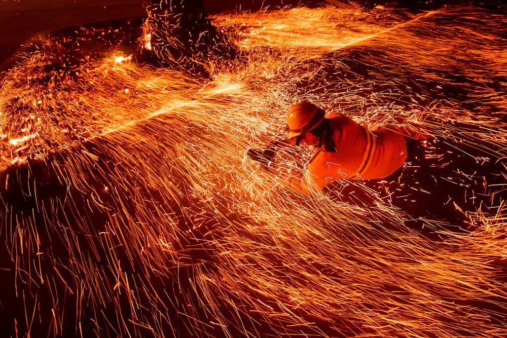 Justin Sullivan, a photojournalist with Getty Images, was watching a KFC restaurant burn to the ground in Paradise, California, when he decided to lay down and take a picture. Thousands of tiny embers flew toward his face as he steadied his camera. Noah Berger, an Associated Press photojournalist nearby, saw Sullivan’s bold move and decided to snap a picture of his own.