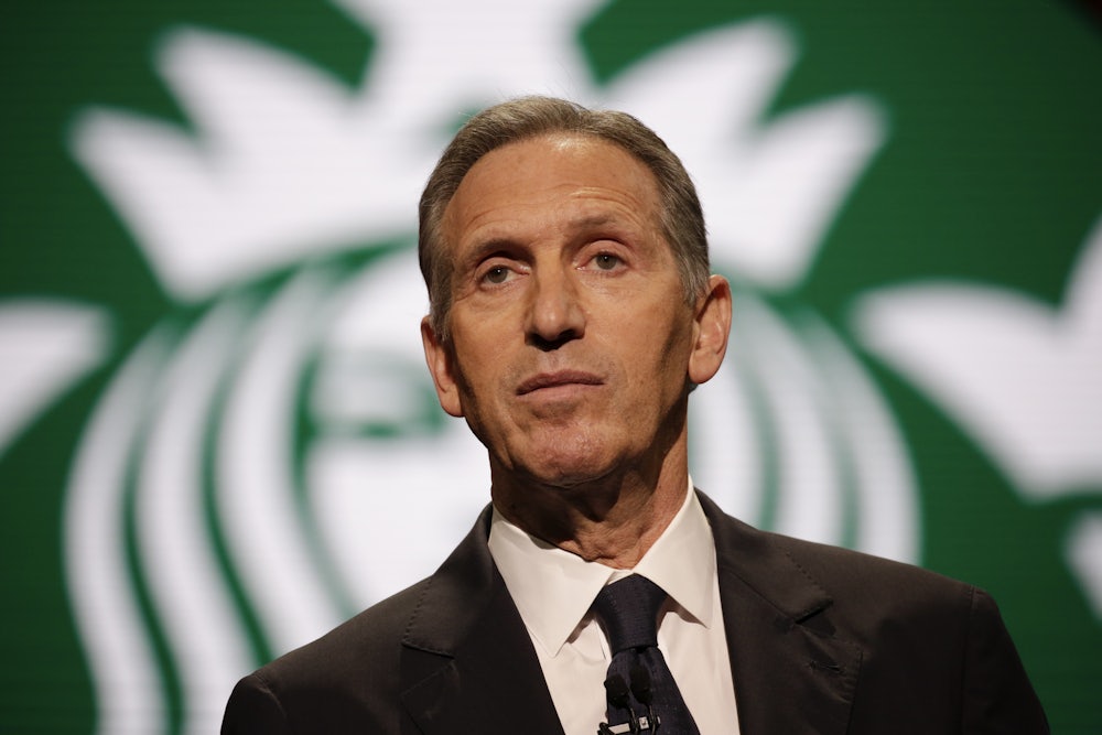 It was the humiliation of shooing away debt collectors and begging for money that drove Schultz, who is among the 400 richest people in America, to provide benefits for his employees. In From the Ground Up, like his earlier memoirs, Schultz proudly notes that Starbucks was the first company to offer both health insurance and stock options to its employees. In Schultz’s telling, the benevolence of corporations and a public commitment to the dignity of work can cure everything that ails America. This combination, in Schultz’s view, can not only lift people out of poverty, but help solve the country’s most complex and intractable problems, like racism—a line of thought that led to Starbucks’s disastrous Race Together campaign. Schultz is now making the case that the same approach could work politically: that the government must unleash the brilliance of American corporations. For instance, he recently said he would ask “tech companies” to “solve the problem of border security.”