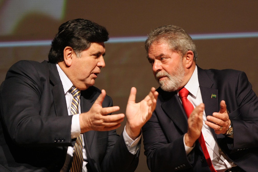 Sixteen years later, in 2006, he successfully rebranded himself as a centrist pragmatist who took pains not to identify too closely with the so-called Pink Tide, the wave of leftist governments that swept Latin America from the early twenty-first century until about 2016. In an interview at the time with the Washington Post, García declared that he could be “useful to Peruvian society, to its middle class, to its small businesses, to its people who have democratic ideas, who do not like [Venezuelan President Hugo] Chávez, who don’t like Evo Morales and feel that I am useful to do things differently.” He dismissed what he called the “Chavez phenomenon” as “militarism with a lot of money.” Asked if he had any intention of pursuing a larger role for Peru in the region as a counterpoint to Venezuela and, implicitly perhaps, in honor of the historic aspirations of his party, García told the interviewer that that was “the last thing I want, to be South America’s sheriff. I want to accomplish things in Peru.” Asked to describe his political inclinations at the time, he said: “I see myself between Chile and Brazil—both have been successful. [Brazilian President] Lula is a realist. And the Chilean governments have had good technical teams and have devised intelligent policies like credit for small businesses.” In retrospect, it’s clear that while often considered an inept populist by many in his country and beyond, García in 2006 was trying to signal his willingness to engage in a more practical manner with international financial institutions and politics as usual—which, as we now know, was rotten to the core.