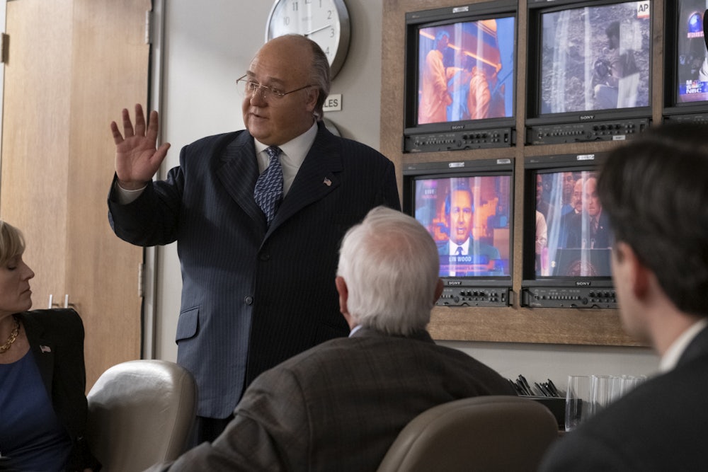 The Loudest Voice is a grotesque show that revels in the bodily details and functions of Ailes and his well-compensated minions. We see images of Ailes bleeding from the foot—a reference to his hemophilia. There are extended scenes of him getting blow jobs from a Laurie Luhn, played by Annabelle Wallis. Doors close as he grabs the slender waists of blonde women who come to him looking for work. He screams at men and brunette women in pantsuits, sweat spackling his upper lip. He is the ranting, heaving, ideological tyrant who creates an empire of ranting, heaving, ideological tyrants, which he boasts will “sell to the forgotten America, that their voice can and will be heard. Sell them their vision and the world the way they want it to be ... We will reclaim the real America. We will challenge the existing agenda and,” he says in a moment of titular pleasure, “become the loudest voice in the room.”