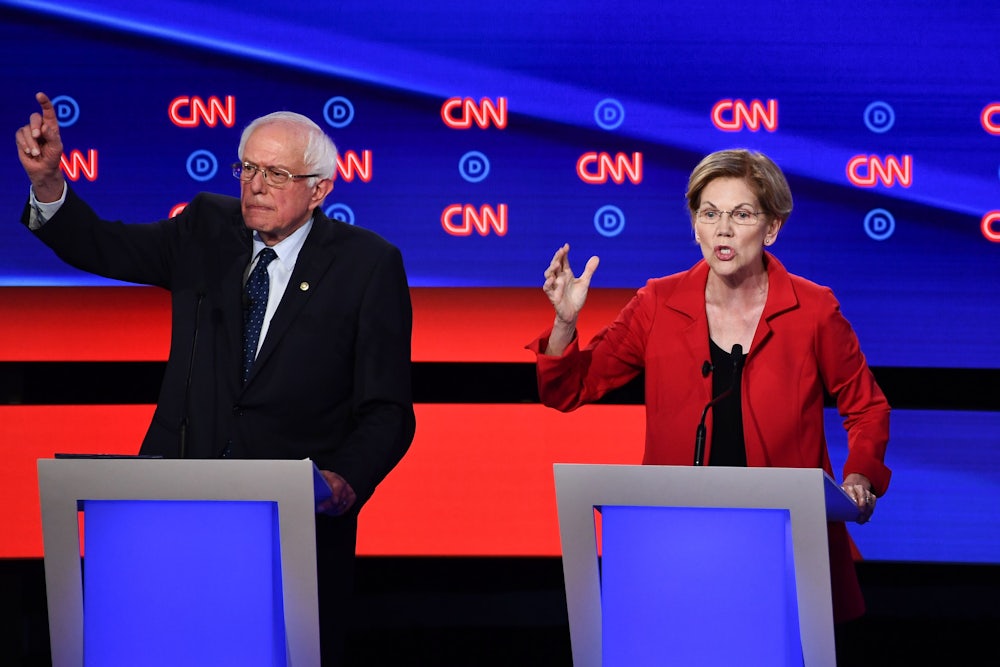 Warren set the tone for the night in stark terms. “We’re not going to solve the problems we face with small ideas and spinelessness,” she said in her opening statement. “We need to be the party of big, structural change. I understand what’s broken, I know how to fix it, and I’m willing to fight to make it happen.” Sanders, who played the bad cop to her good cop, reiterated that his goal was to “not only defeat Trump but to transform our economy and our government.”