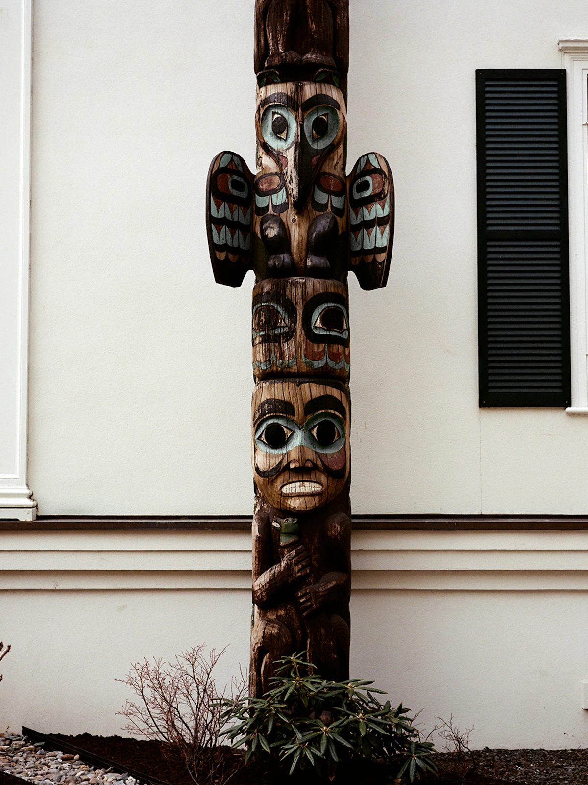 to their myths: totem poles, carved from massive logs of cedar and adorned with