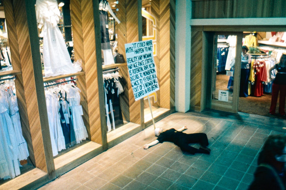 This was the physical anchor of Three Weeks in May, but events activated and drew awareness to it. The artist Leslie Labowitz organized four lunchtime protest performances, while Lacy created a more intimate, weekend-long piece that was closer in kin to Ablutions. There were artistic rituals, self-defense demonstrations, a press conference with LA’s deputy mayor, and moments of silence in churches. Lacy brought together government officials, feminist activists, female artists, and the media, collaborating with the city attorney, the LAPD, the American Civil Liberties Union, and organizations like Women Against Violence Against Women and Men Against Rape, among many others. In the process, she blended performance with activism to model yet another new genre, which would become the foundation of her art career: social practice.