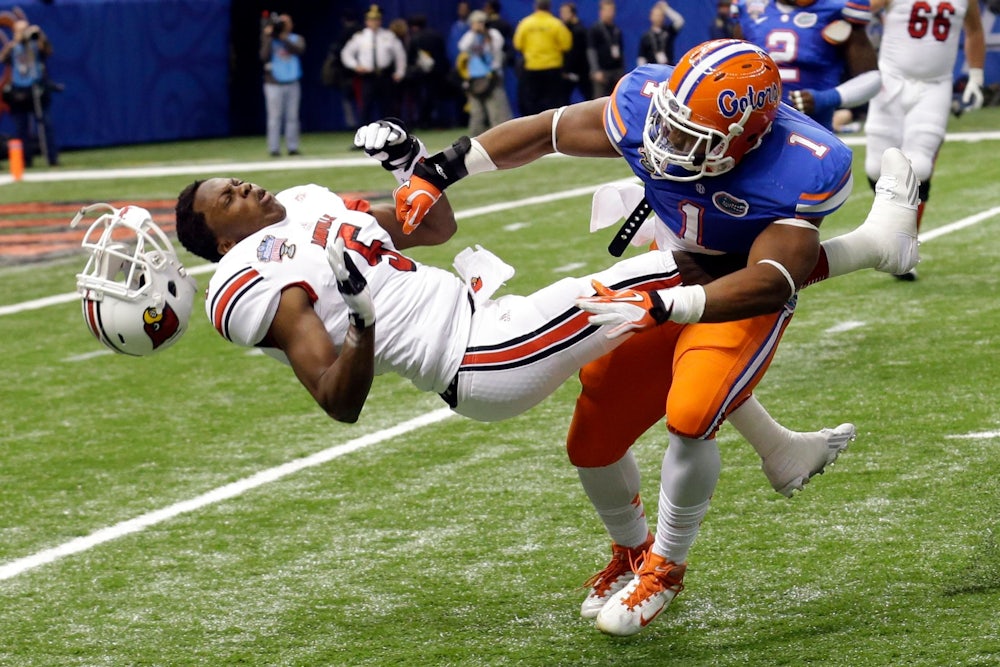 In the early days of the sport, it was literally combat: Between 1869 and 1905, at least 50 young men died playing the game. There were hundreds of broken necks, perforated hearts, catastrophic brain injuries. Horrified at the bloodletting in the 1894 Harvard loss to Yale, The New York Times editorialized, “The record of French duels for the last dozen years fails to show such a list of casualties as this one game of football.” After the 1902 Clemson-South Carolina game, groups of students threatened each other with swords and bayonets in downtown Columbia. In 1897, 17-year-old Richard Von Albade Gammon died of massive head trauma playing for the Georgia Bulldogs against the Virginia Cavaliers. Georgia’s governor and legislature were all set to outlaw college football until Gammon’s mother begged them not to, saying “it would be inexpressibly sad to have the cause Von held so dear injured by his sacrifice.” Dulce et decorum est pro patria mori—or pro ludo, for that matter.