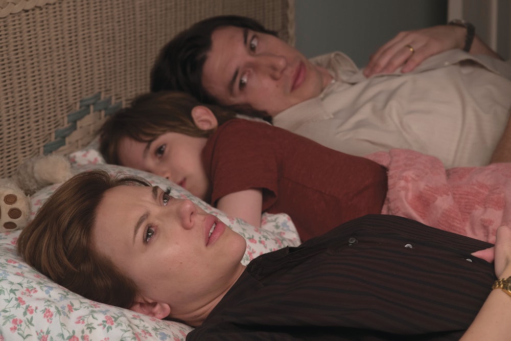 You appear to have been dropped in at the climax of a romcom, when the man enumerates the large, small, and idiosyncratic things he appreciates about the woman, all those reasons he can’t love anybody else. Only here they’re already married, with a son, past the happy-ending goalpost, and both parties offer up their separate lists. Nicole (Scarlett Johansson) is a brilliant actress, a mother whose tireless playfulness more than compensates for the trail of mess and open cupboard doors left in her wake. Charlie (Adam Driver), the director of their New York theater company, is a self-made man who’s transcended a booze-shadowed childhood, who sews on buttons and loves getting up with his kid in the middle of the night; he even has taste and “never looks embarrassing, which is hard for a man.” The charismatic wattage of both stars, which could have made this stuff feel extra emetic, works the other way: There’s no difficulty imagining each as an irreplaceable love object.