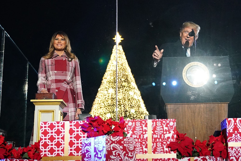 The blank and baffling overstatement of it—the First Lady personally sifting plastic dandruff onto a spruce, as one does, the simultaneous clutter and emptiness, the combination of voluminousness and absence—might be poignant under other circumstances. There’s no fun in it, of course, because Trump and his family are not people who are into fun. What’s spooky about it goes beyond Melania’s personal uncanniness or Trump’s world-historic tastelessness or the built-in stiltedness of White House ritual. The pure anhedonic cheerlessness of it all points back to a deeper psychic deficit: an inability to understand what any of this might even be for, if not to spite or defeat someone else. Of course there’s too much of it. They don’t know when to stop—they never have known when to stop, they do not know how to stop—because they have never really understood why they got started in the first place. After all, look where it’s gotten them.