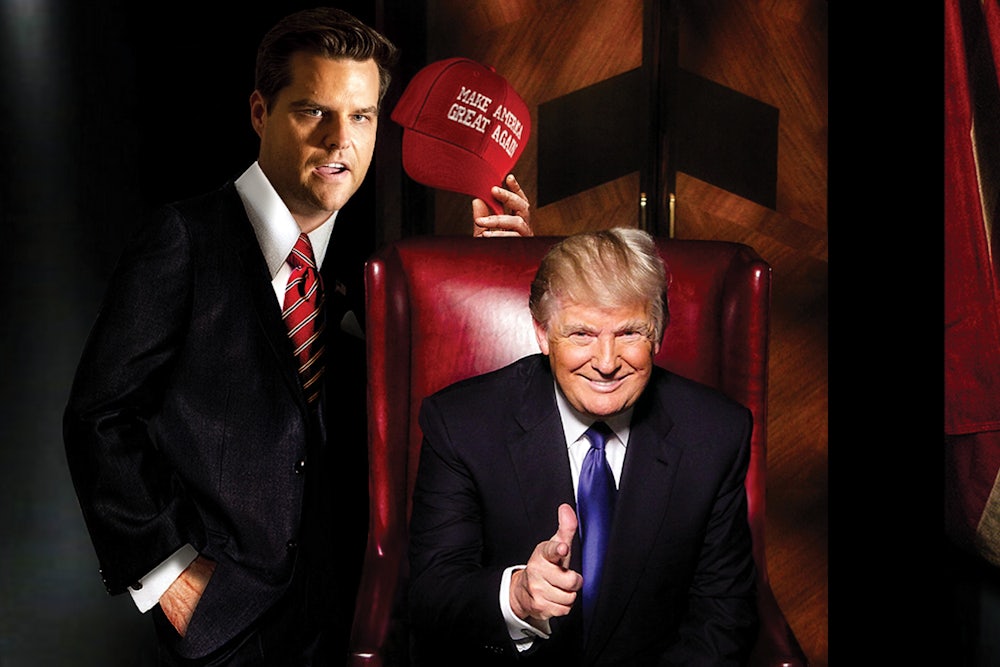 If Donald Trump owes his fame to saying, “You’re fired!” to a crew of fake businesspeople, then Gaetz is perfectly positioned to assume the role of cocksure reality TV contestant: confident in his own inevitable status as a finalist on the biggest soundstage of all.