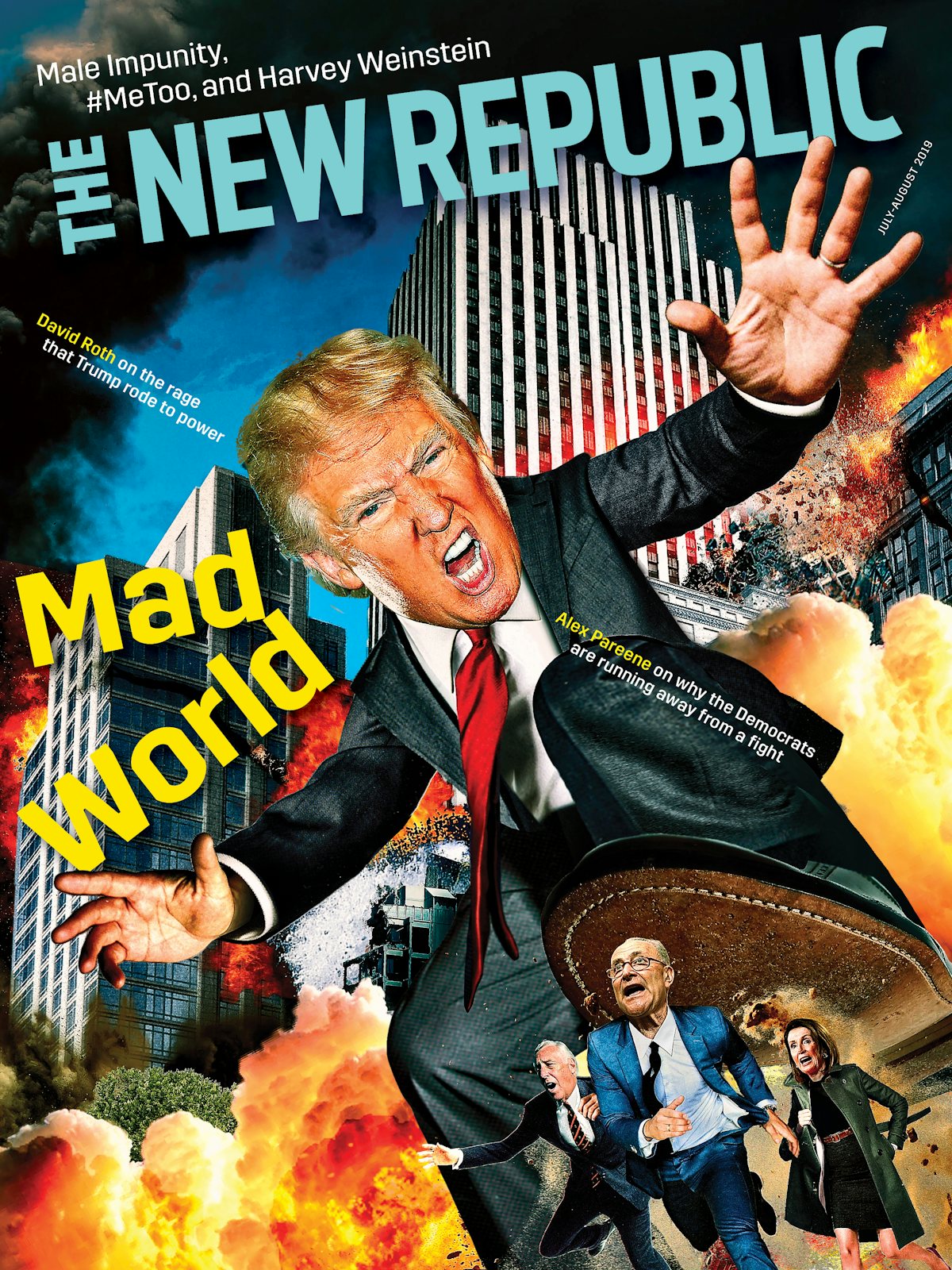 New York, NY—(June 20, 2019)—The New Republic’s July/August 2019 cover feature creates a dramatic contrast between the approaches of a fractious President Trump and a cowed DNC. In two provocative pieces, Alex Pareene and David Roth analyze this collision of political perspectives, delving deeply into the root causes of this great chasm.