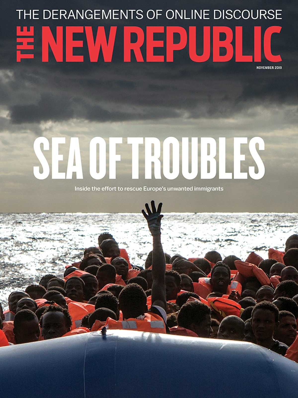 New York, NY—(October 18, 2019)—The New Republic’s November 2019 cover story, “Treading Water,” features writer Ben Ehrenreich’s harrowing journey as a crewmember on the Alan Kurdi, one of the few civilian- and NGO-run rescue ships searching for immigrants stranded in the Mediterranean Sea. As European nations try to stem the influx of immigrants, Ehrenreich writes of the “true shame in...thousands of refugees from war and famine risking their lives on the high seas, and the malign neglect of regional leaders...that consigned their fate into the hands of makeshift and underfunded civilian rescue ships.” The work of the civilian and NGO crew sends a challenge for those demanding change: “not only to witness but to act.”