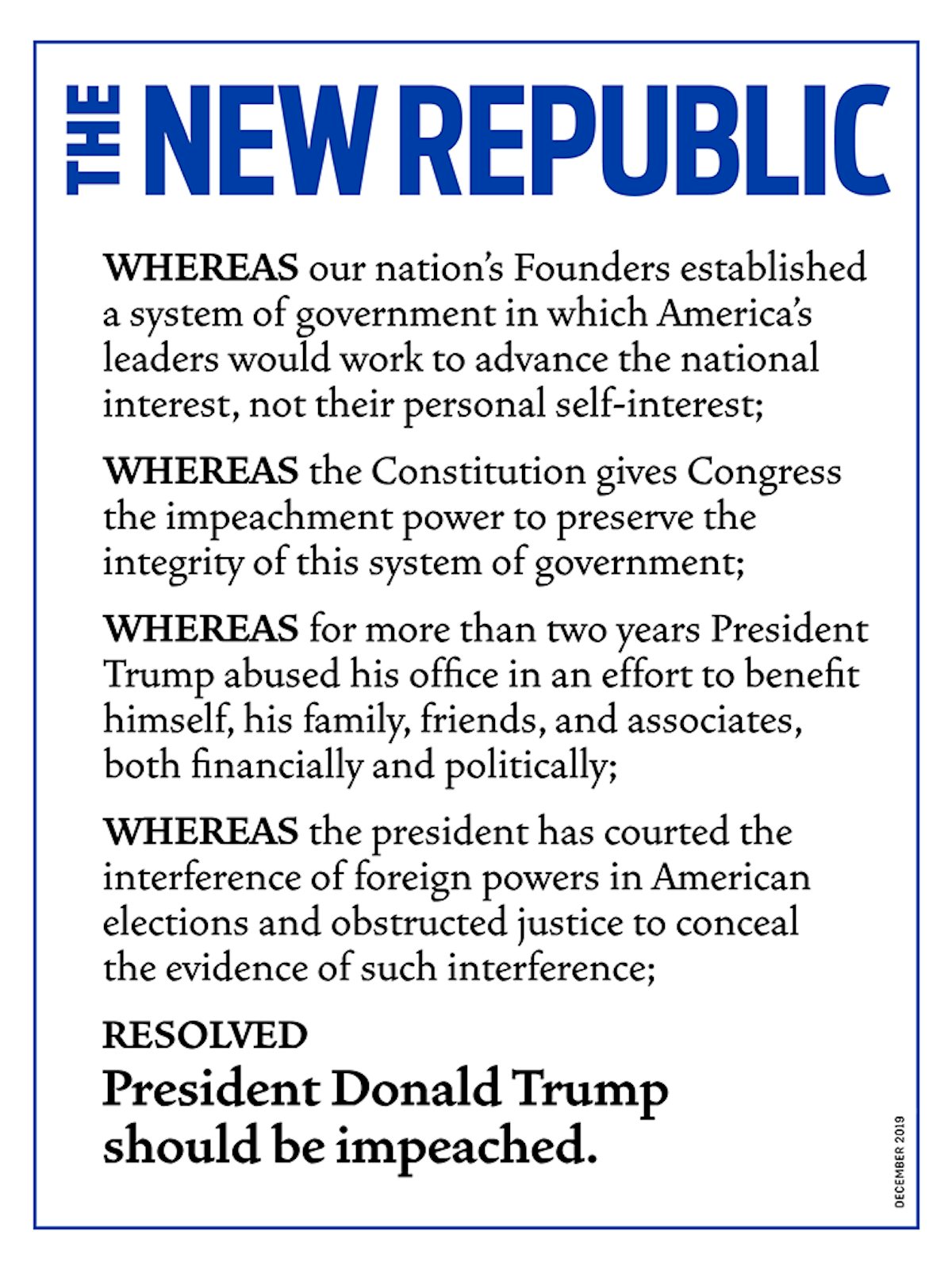 New York, NY—(November 21, 2019)—The New Republic’s December 2019 issue voices passionate support for the impeachment of Donald Trump. The magazine continues its tradition of dynamic political journalism with pieces by Brianne Gorod, Elizabeth Wydra, and Alex Pareene that together present the in-depth case for Trump’s removal from office and press Democrats to face up to their constitutional duty without fear.