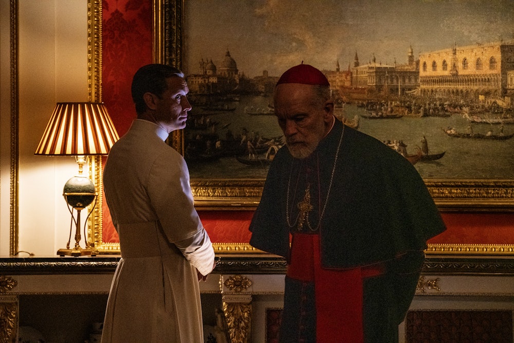 The titular New Pope is, as you are no doubt aware if you have seen this season’s marketing, played by John Malkovich: An Englishman with an extremely loony accent, Sir John Brannox is a fop, a former punk, and softhearted enough that other characters constantly talk about his being made of porcelain. There is a running gag about his close friendship with Meghan Markle and another about his being a “socialite.” “My favorite people are Dennis Hopper, Jack Nicholson, Sean Penn, Sharon Stone, and Marilyn Manson,” he remarks while watching Easy Rider. “They seem free.” When he says “parents,” it sounds like he’s saying “parrots,” and when he says “pope,” the word has more syllables than it ought to have.