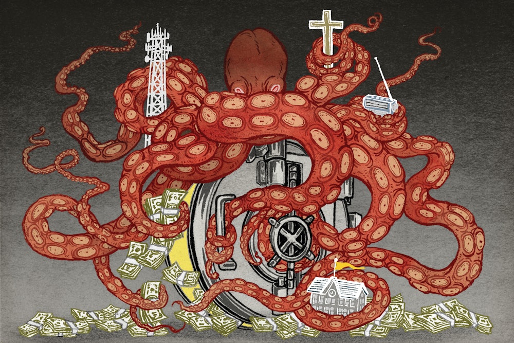 Over the following four decades, CNP members and allies extended their influence—and poured their money—into virtually all facets of American political life. Its members founded vast media empires, including Salem Media Group, Bott Radio Network, and American Family Radio, which Nelson describes as “all but invisible to the urban Northeast” but which have blanketed the airwaves of the Bible Belt and the Plains states with hard-right news and commentary; Nelson mentions segments entitled “Infanticide Adopted by Democrats” and “Homosexuality is the Dividing Line between Light and Darkness,” and one raging against “the demon-god Allah.” These three media behemoths now control hundreds of stations in 46 states, but with a special focus on small and midsize markets abandoned by ABC, NBC, and CBS, and where NPR coverage is sparse.