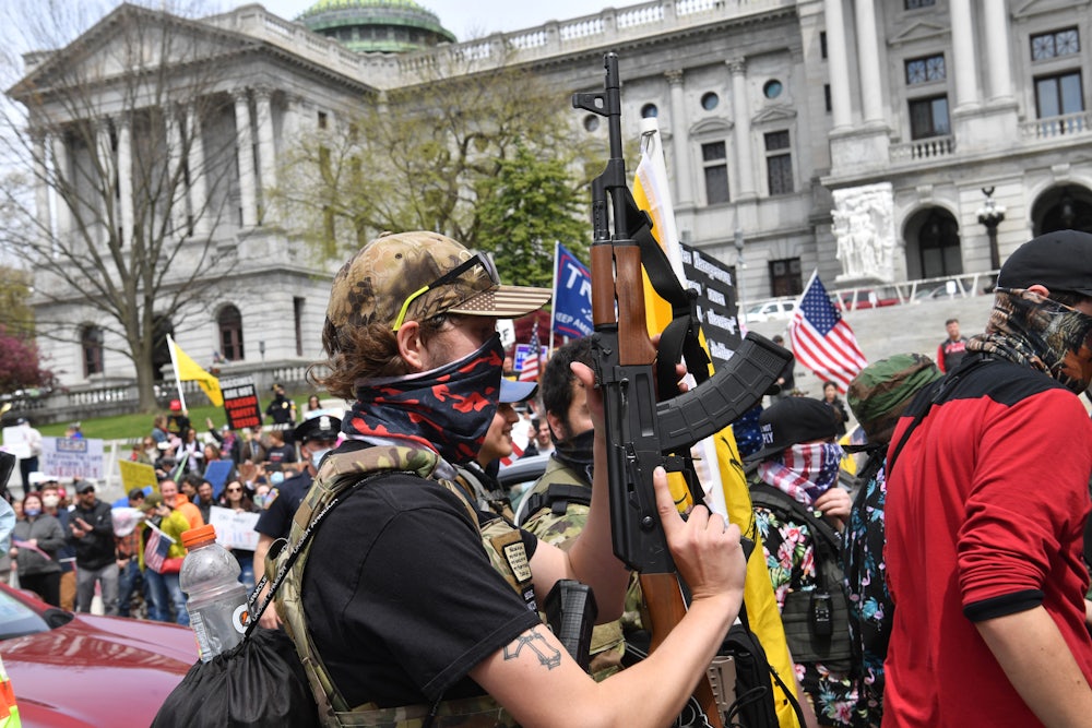 The images are striking: A young white man in the Michigan state capitol staring blankly ahead, his bare scalp split by a mohawk, the butt of his scoped rifle resting against his carrier vest. Across the room, a line of state police and sergeants at arms acted as a silent barricade against the throng of protesters demanding the state reopen. The week before, there had been a similar scene as another group of men, firearms in hand, piled out of the back of a flapped truck parked in front of the Pennsylvania State House, which was surrounded by hundreds of right-wing, overwhelmingly white anti-quarantine protesters. One person was issued a citation.