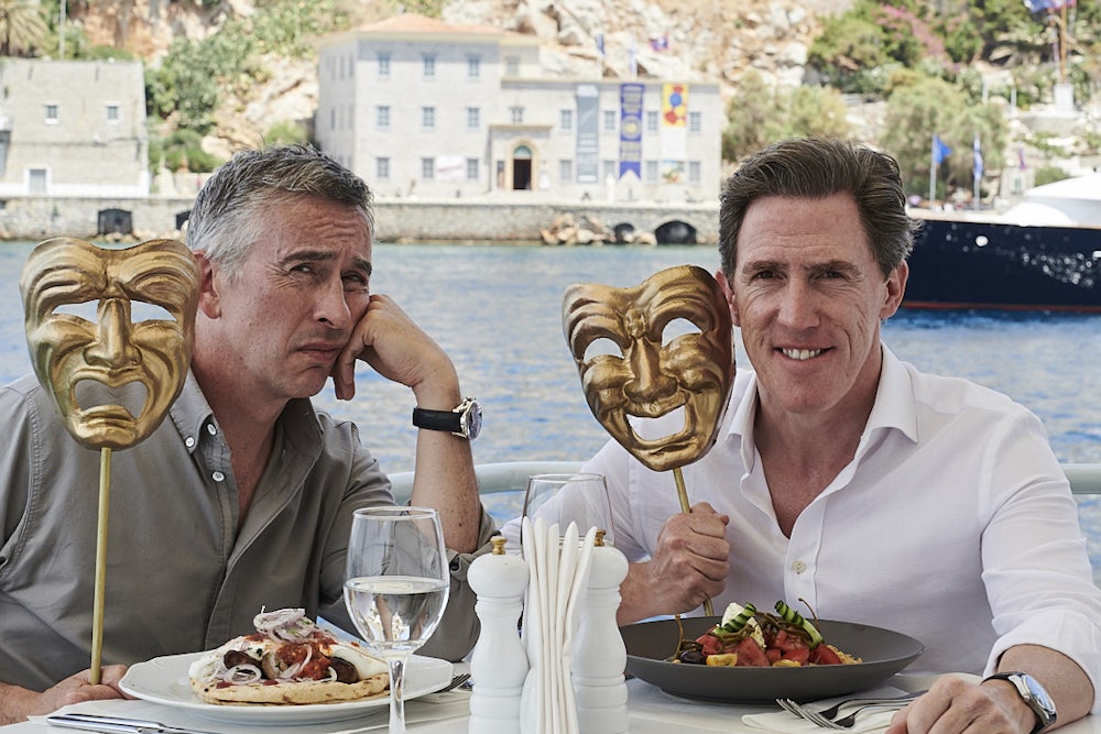 There is an unexpected poignancy to all this repetition. The impressions are mostly the same, although The Trip to Greece only has a dash of Coogan and Brydon doing their most famous bit, dueling impressions of Michael Caine. (The Trip franchise has given a whole new meaning to the line “You were only supposed to blow the bloody doors off!”) And over so many hours of film, stretched out over a decade, their on-screen relationship has come far closer than other bromances in depicting what male friendship is really like.