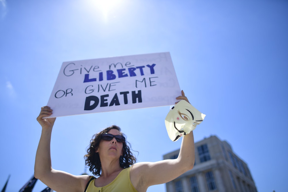 Let’s return to the example of Reno, since he manages to encompass both the raging id of the anti-lockdown protesters and the philosophical justifications of their actions that have appeared in the conservative press. One of his “Coronavirus Diary” entries begins with him visiting an emergency room in an outer-borough hospital. He can’t say more, though, because “the present conditions of public health hysteria” mean his host “might lose his job if higher-ups found out I penetrated the ‘no visitors’ cordon sanitaire.” Reno notes that, after cases of COVID-19 flooded the hospital in late March and early April, the doctor says they had since plummeted—a development Reno passes over as a happy mystery, never connecting it to the stay-at-home orders and economic shutdown that he has called “pointless” and “cowering.”