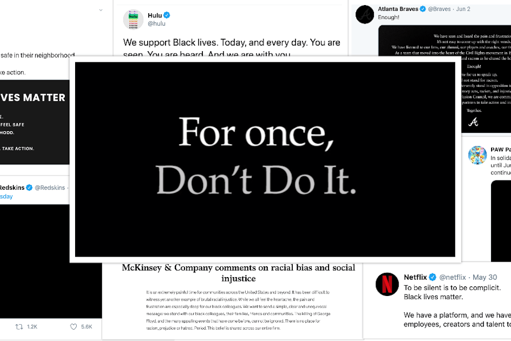 Consider this brief sampling of corporate banality: “To be silent is to be complicit. Black Lives Matter,” Netflix tweeted on May 30. “We support Black lives. Today, and every day,” Disney-owned Hulu echoed six hours later. “For Once, Don’t Do It,” said a Nike ad. “Without the Black community, Reebok would not exist. America would not exist,” read the competing shoe company’s home page. “There is no place for racism, prejudice, or hatred,” stated McKinsey. “We will not stand for racism,” said the Atlanta Braves, incredibly. The Washington Football Slurs even got in on it, posting a black box in solidarity. NextDoor, a cesspool for racist gentrifiers and profilers, put out a message stating, “Everyone should feel safe in their neighborhood.” Even PAW Patrol, the animated TV show for children, posted a solidarity message: