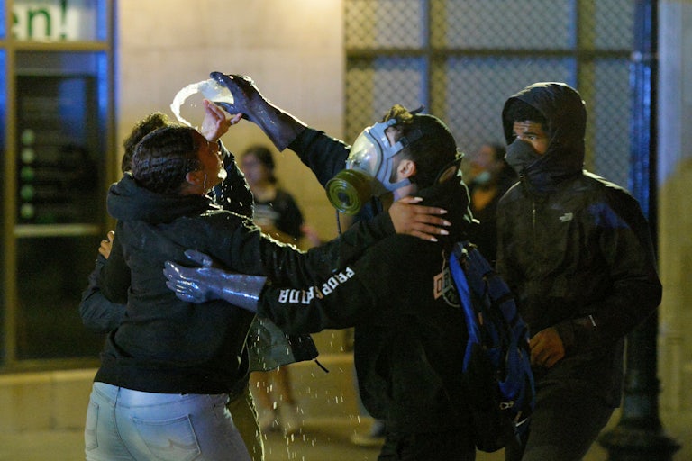 Emma, 23, Pittsburgh: Some young white men had burned an empty cop car. But at that point in the protest, a lot of people were starting to go home. I don’t even know how many cop cars came down, maybe 20-plus? They kettled everybody. We were a little further up, maybe a mile or two, and we saw all of the cars and thought, “Alright, they’re going to start teargassing people and hitting people with pepper spray.” And when we got there, that’s what they were doing. For the most part, people had their hands up. They made barricades with trash cans. It felt like everyone was just asking to go home, but they started hitting us with tear gas. I had goggles on, so I felt comfortable being in the crowd. I don’t have a background in medicine, but I had read a lot the night before to prepare, and I felt like, I’m ready to put saline solution in someone’s eyes. The people they hit, the ones we treated, were just walking. They were so young: Two were in their late teens, maybe.