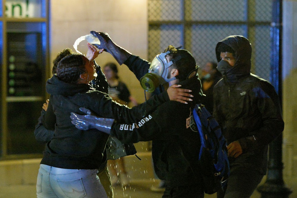 Shirin: On Friday night, I was washing out someone’s eyes on a sidewalk, fairly removed from the protests, when someone kicked me in the back, and it was a police officer trying to tell us that we had to move. And I was trying to communicate to him that we would comply as soon as possible, but the woman I was helping could not see and could not get up. We were surrounded, and one of the officers grabbed her by the arm and dragged her into a nearby park. And I had to finish and help her there.
