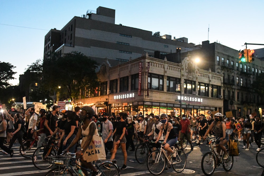 Over the weekend, de Blasio announced his decision to lift the curfew a day earlier than planned, having been routinely and publicly denounced for letting the NYPD brutalize his constituents under its cover. This will most likely be chalked up as a strategic win for demonstrators. But in the endless writing about these individuals, their demands and moral virtue, observers have yet to reckon with the full emotional tectonics grinding beneath the protests. Through their antagonizing and disobedience of persecutory authorities, people have gained newfound freedom and ownership in a city that often tries to shake them off. Protesters may be planning concrete actions, but they also work within, to borrow phrasing from Mimi Sheller, “a feeling, an improvisation, a break.” What is it like to gather with thousands during the day and then to bike home at night on a deserted avenue once clotted with Ubers, SUVs, sports cars, and Subarus? What does it mean to regard the official laws of the street as flimsy and expendable distractions? Which visions of the future do these moments impart, and which old, commonsense realities do they make suddenly unacceptable?
