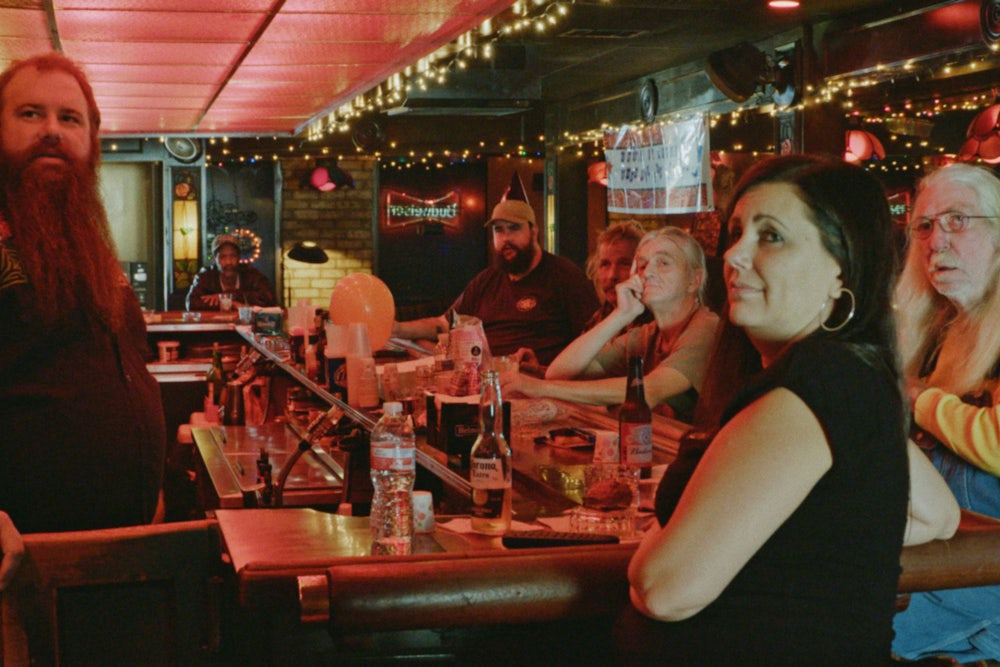 The presence of the cameras in the mirrors draws attention to the Rosses’ process, which turns out to be highly idiosyncratic. The shoot went like this: Over three days, they filmed a group of people improvising in a New Orleans bar, then later cut those scenes with footage from around Las Vegas to make the purported location credible. The cast are not professional actors but rather a mixture of charismatic people the brothers already knew personally and strangers they’d cast after meeting them in situ, at dive bars. Their job was essentially to be themselves. They drank, had a good time, sometimes cried, and sometimes fought. Now and again the brothers introduced prompts (putting Jeopardy! on the bar TV, for example) or made concessions to the actors’ demands (playing music, even though it made recording audio harder).