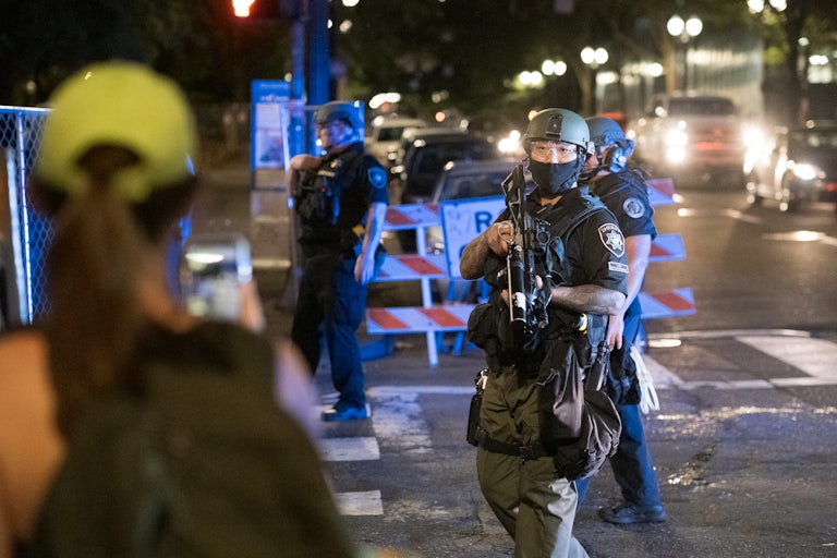 As The Washington Post reported in its story about the arrest, Pettibone “did not know whether the men were police or far-right extremists, who frequently don militarylike outfits and harass left-leaning protesters in Portland.” When unknown men in uniform grab people off the street, or when lines of unidentified, armed men in riot gear (who refuse to tell reporters who they are) stand menacingly at the edges of a protest, it exposes the raw edge of brute force in this country’s version of law and order. It’s no longer about the state having a legitimate monopoly on violence; you no longer know whether the guy with a gun is just a nutjob from a militia or an actual police officer whose commands you must legally obey. The officers who detained Pettibone are barely operating within the confines of the law; they’re certainly not accountable in the way the police are supposed to be. (Both the mayor of Portland and the governor of Oregon have asked federal forces to leave, to no avail.)