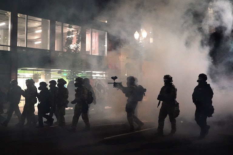In mid-June, when the Trump administration rolled out its executive order in support of law enforcement, the White House referred to police as the “first line of defense here at home.” Ten days later, another executive order proclaimed that “American Monuments, Memorials, and Statues” must be protected from dangerous “Anarchists and left-wing extremists.” Although the orders read more like executive branch shit-posts, these laid the foundation for the Trump administration to use federal law enforcement officers to wage new domestic war against civilians.