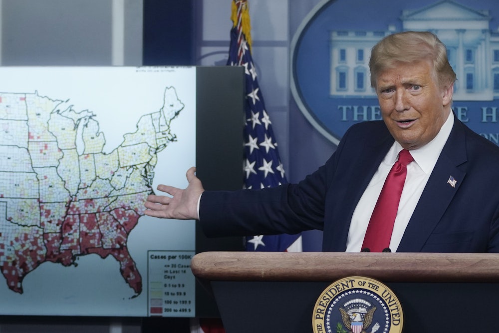 Trump originally envisioned his reelection campaign as part victory lap, part Faustian bargain. “Make America Great Again” became “Keep America Great.” Ignore the corruption and bigotry, and your 401k will keep growing. But his failures to contain the coronavirus pandemic—which has killed at least 140,000 Americans and sent the U.S. into a brutal recession—and his inflammatory reaction to the George Floyd protests threw that plan into disarray. In recent weeks, Trump abandoned any pretense that he possessed either a second-term policy agenda or a positive vision for the country’s future. Instead, he’s pinned his electoral hopes on demonizing Joe Biden and Democratic elected officials.